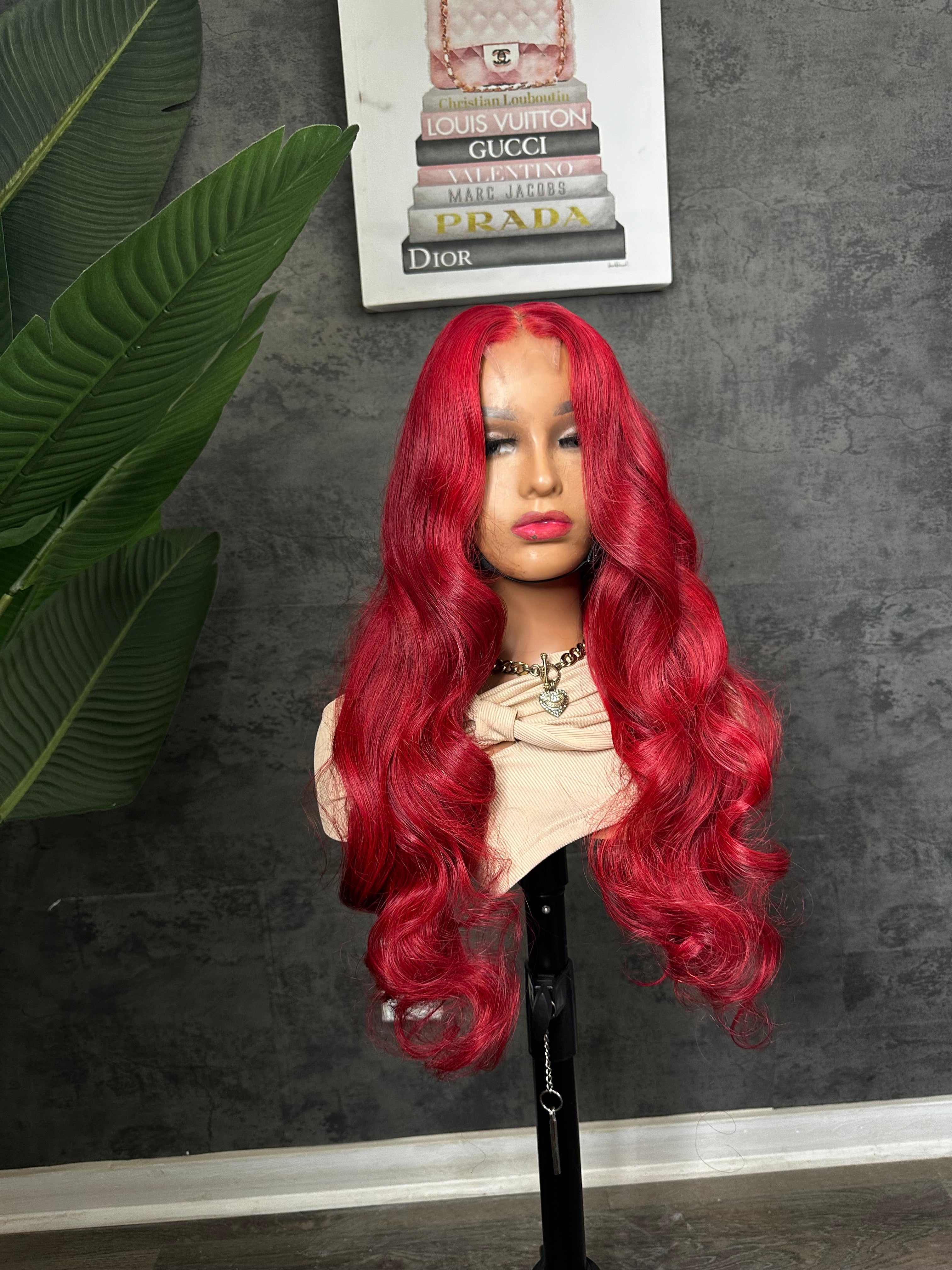 Turn heads with this bold and luxurious 2x6 closure wig, crafted with vibrant red strands that flow into soft, voluminous waves. At 24 inches long and 180% density, this unit delivers both striking length and full-bodied volume for a glamorous, high-fashion look.